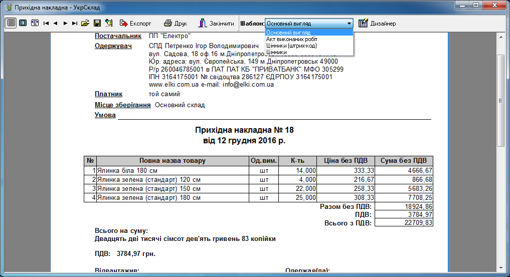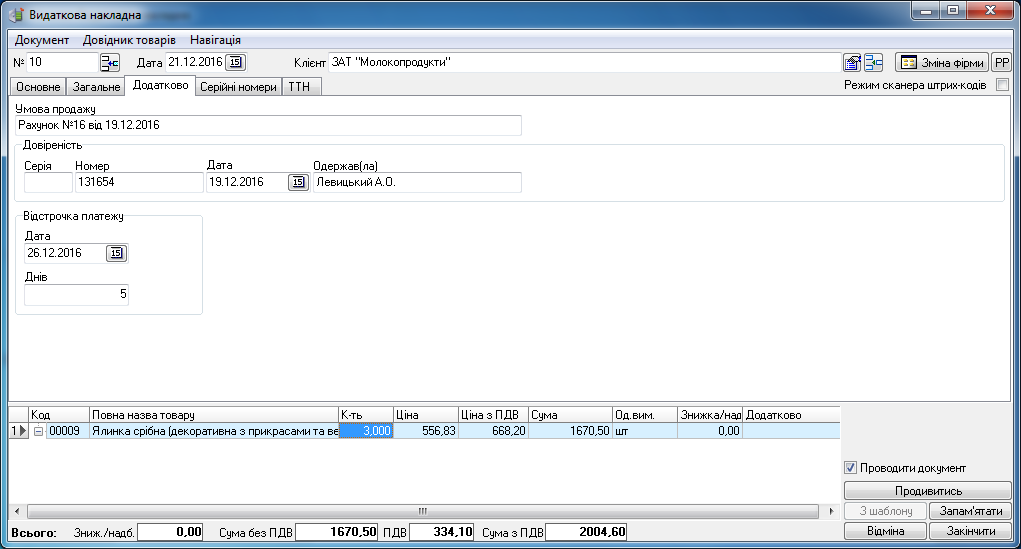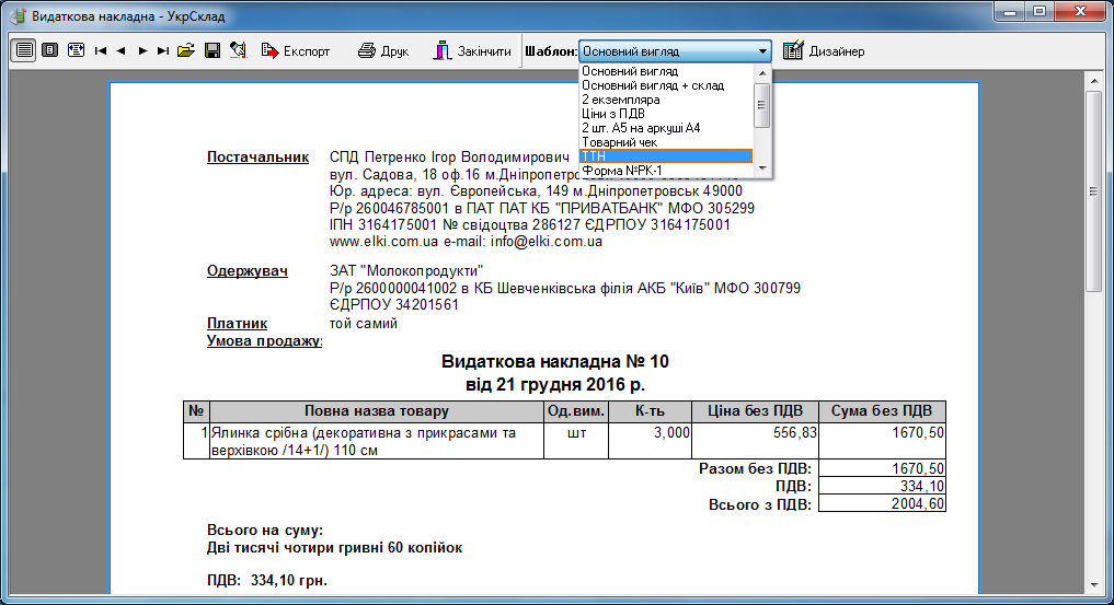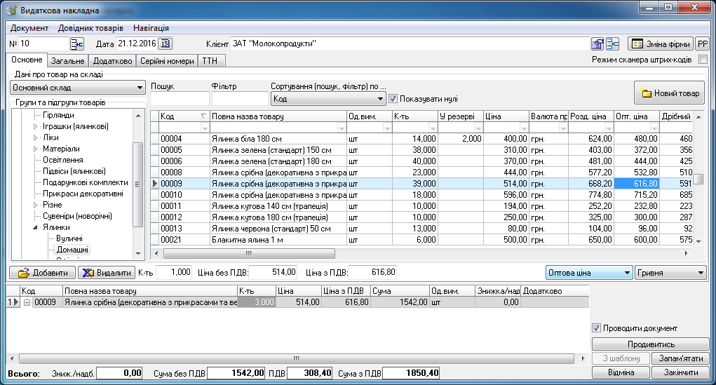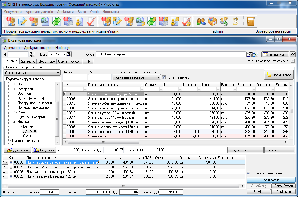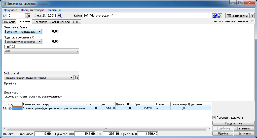Зовнішній вигляд програми на весь екран (виписка видаткової накладної)