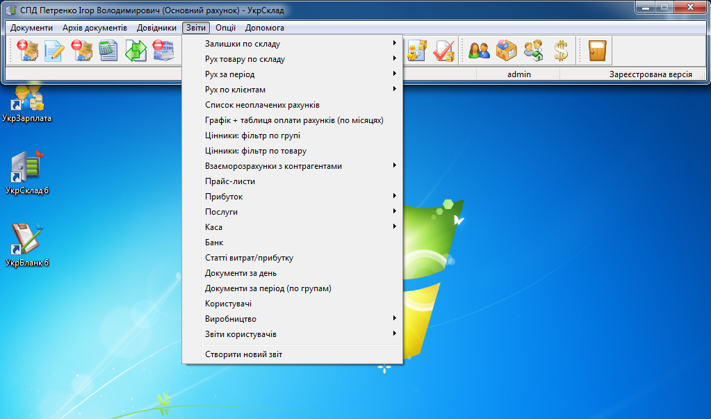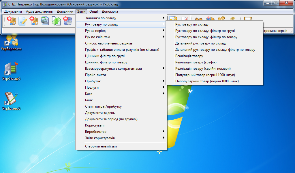 Головне меню програми : вкладка Звіти + Група звітів "Рух товару по складу"