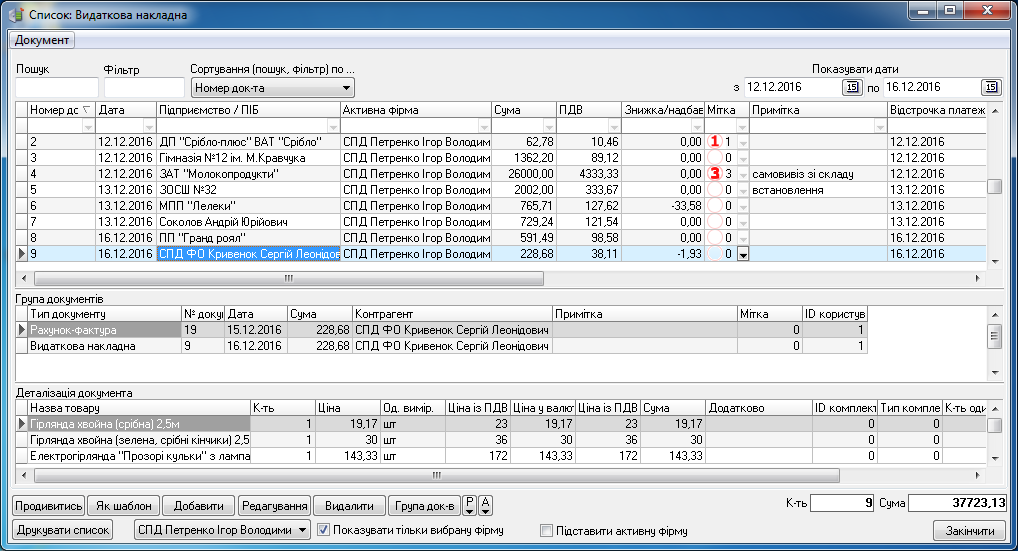 Список документів на прикладі Видаткової накладної + в архіві увімкнено видимість пов