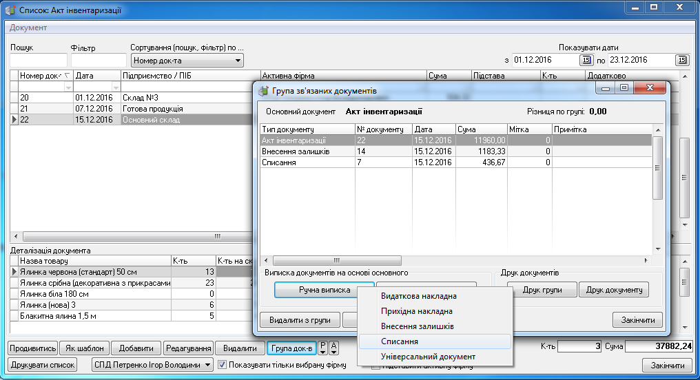 Група документів: Автоматична і напівавтоматична (Ручна) виписка пов'язаних документів на прикладі Акта інвентаризації