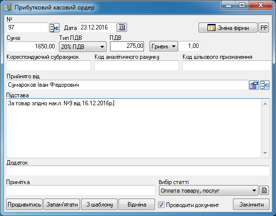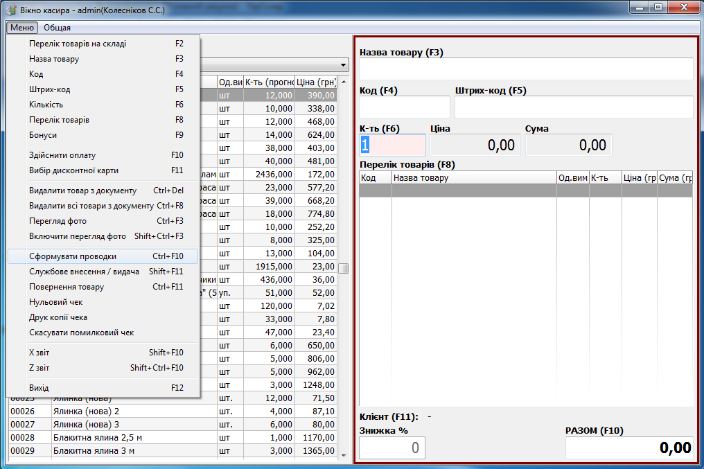 Вікно касира : перелік додаткових параметрів з Меню/Документ