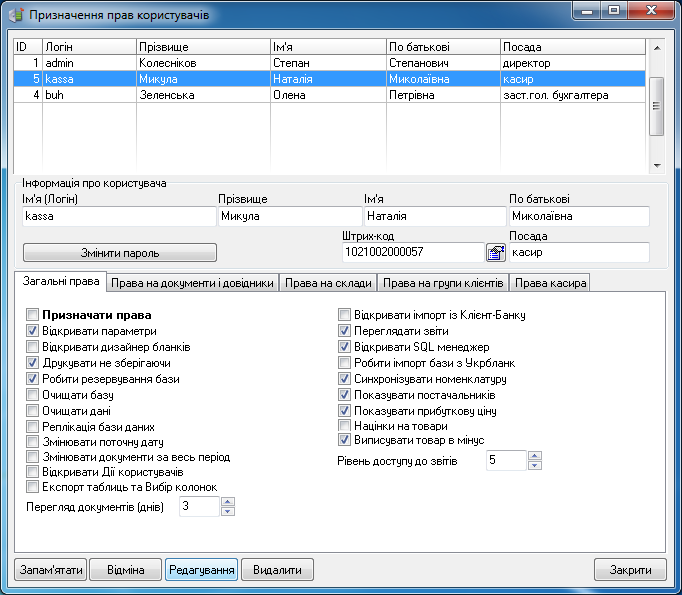 Призначення прав користувачів (вхід по паролю, індивідуальні обмеження на довідники / документи / склади / групи Клієнтів, зміна основних параметрів)