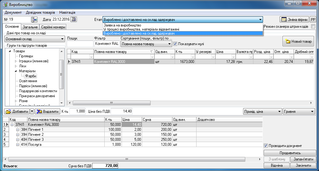 Виробництво : виписка документа, останній етап Вироблено і доставлено на склад одержувач