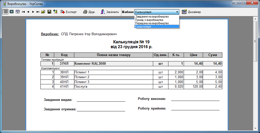 Виробництво : вибір друкованого шаблону Калькуляція для готової продукції