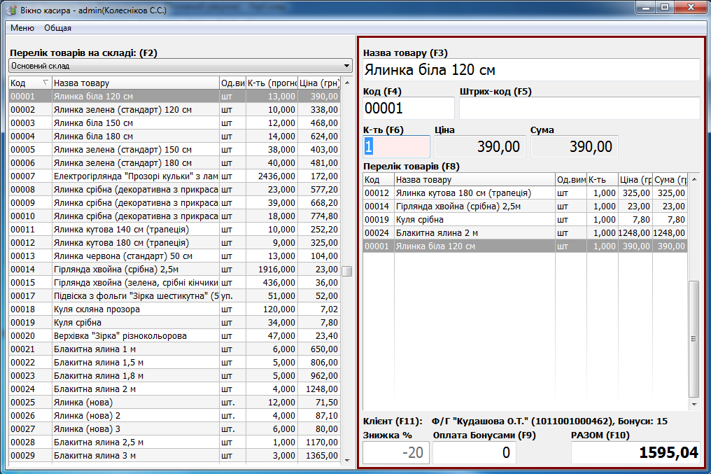 Вікно касира : документ для швидкого продажу, виписка нового документа (чека)