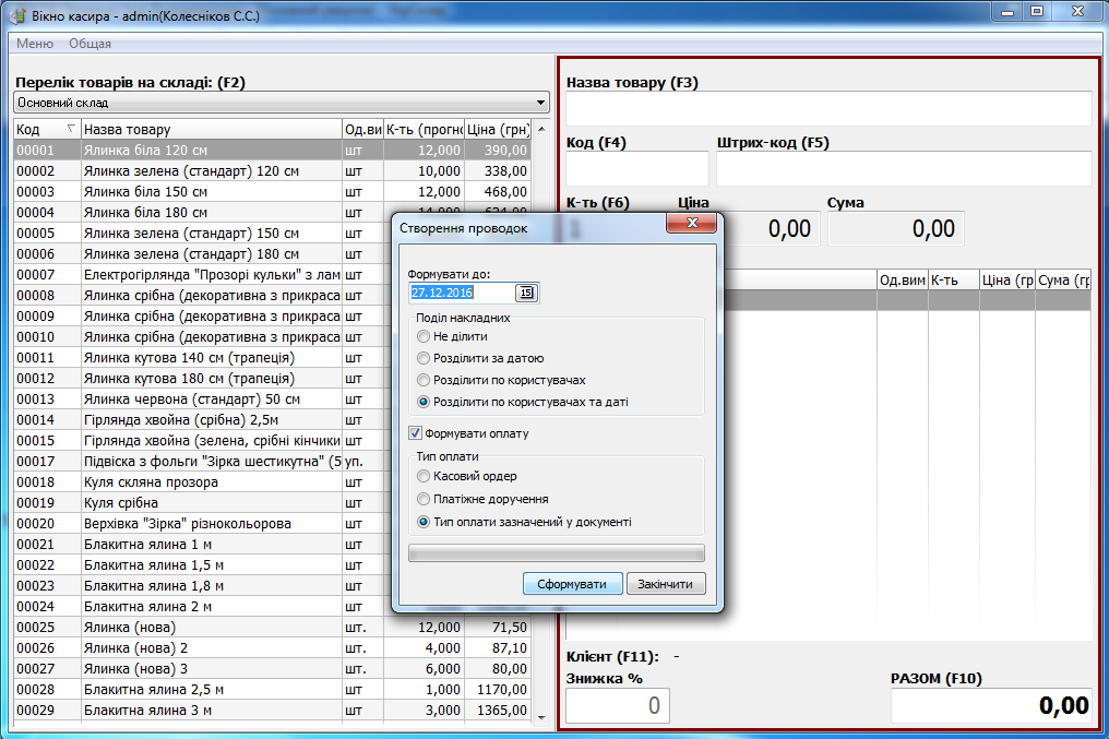 Вікно касира : формування проводок (Ctrl+F10), функція створює на основі чеків видаткові накладні та документи оплати