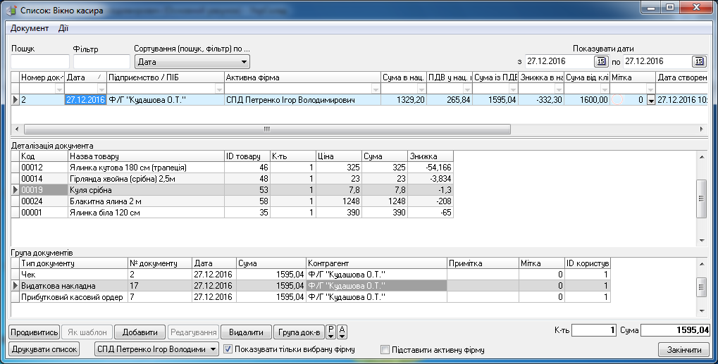 Список документів Вікно касира + в архіві увімкнено видимість пов