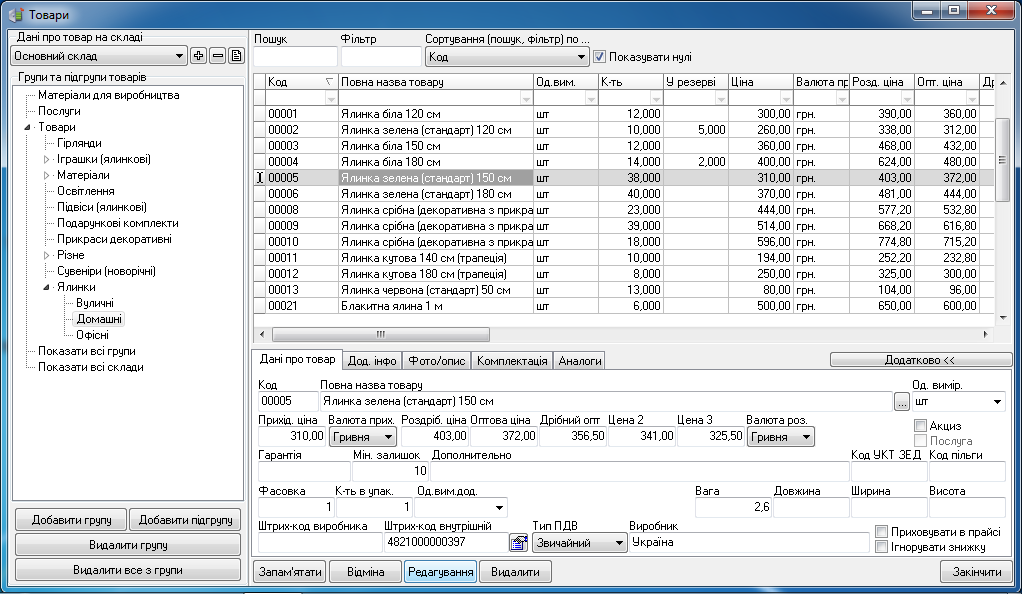 Довідник Номенклатури (товари і послуги) : товар в режимі редагування основних даних