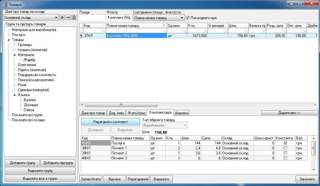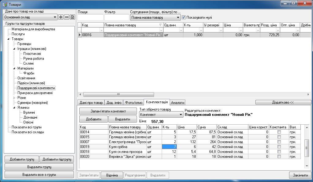 Довідник Товари : вкладка Комплектація (тип збірного товару Комплект)
