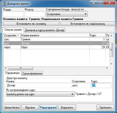 Довідник Валюти в режимі редагування (зміна курсу, суми прописом + динаміка курсу валюти)