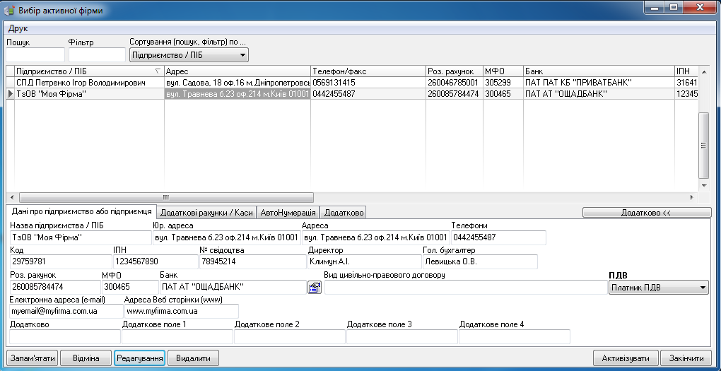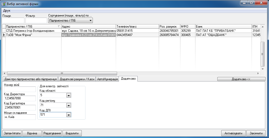 Довідник Вибір Активної фірми : основна вкладка Дані про підприємство або підприємця