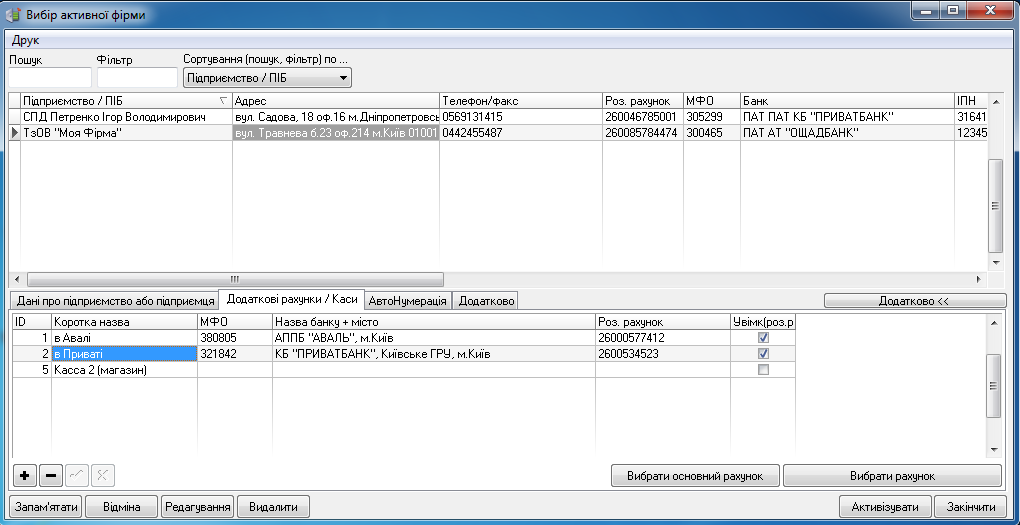 Довідник Вибір Активної фірми : вкладка Додаткові рахунки / Каси