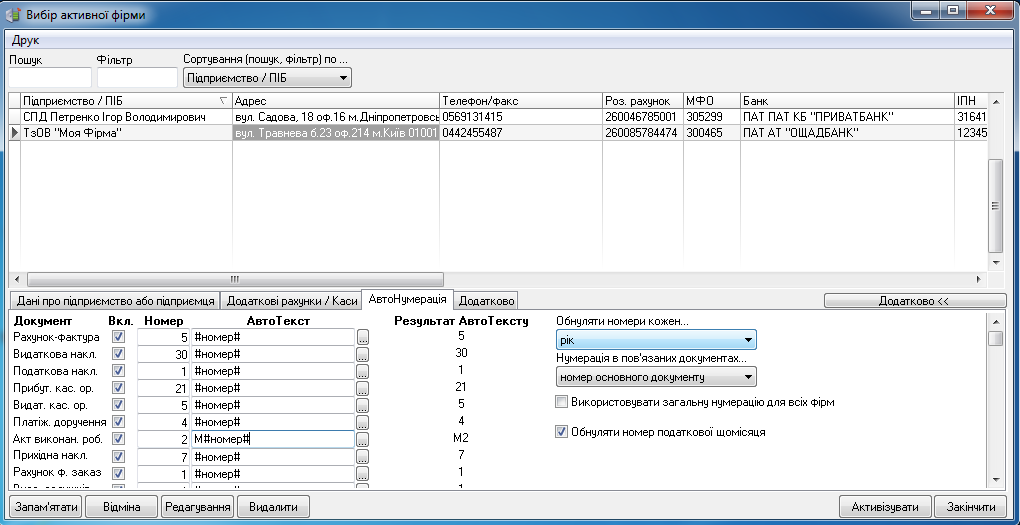 Довідник Вибір Активної фірми : вкладка Автонумерація (індивідуальна нумерація і автотекст для кожного типу документів, загальні налаштування)