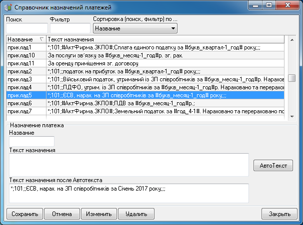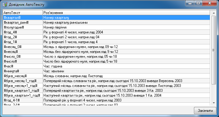 Довідник Автотекста: для форматування рядків автонумерації і шаблонів призначень платіжних доручень