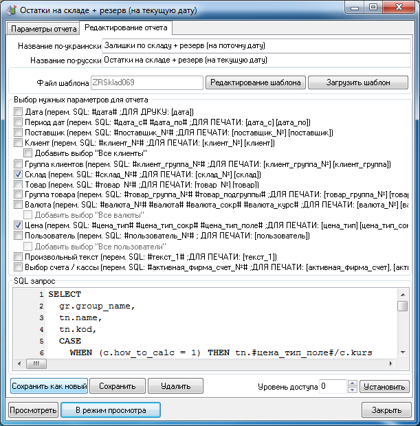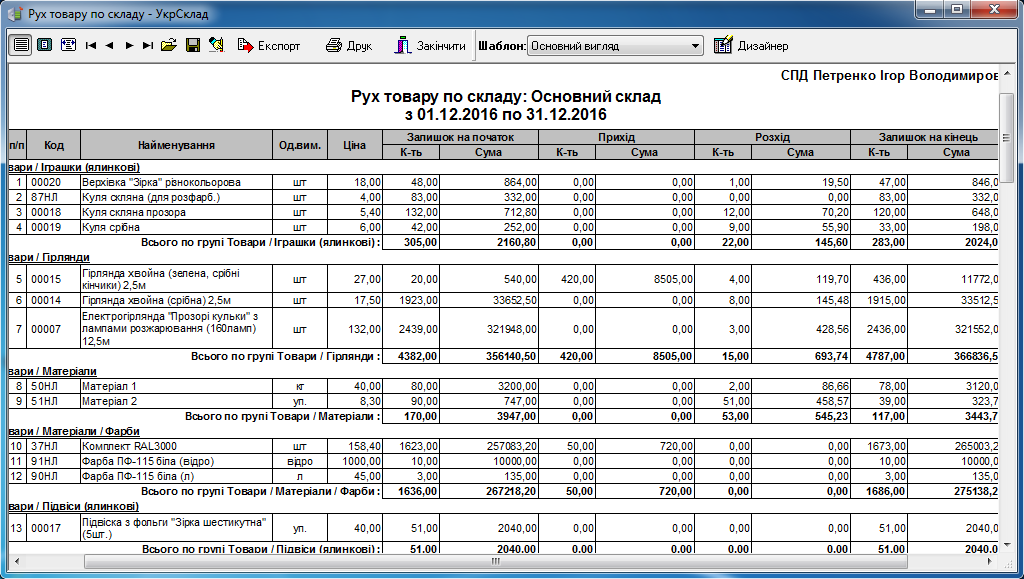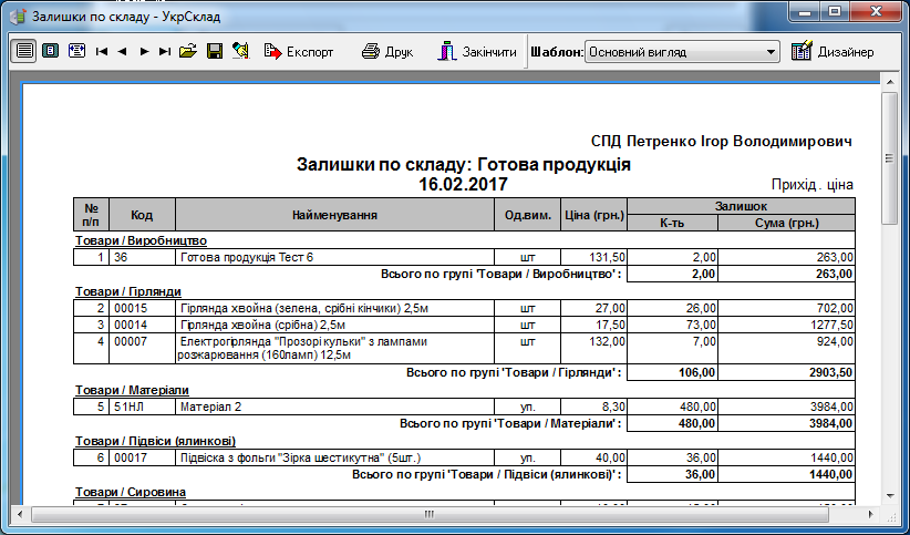 Друковані форми звітів: приклад на основі звіту Залишки по складу