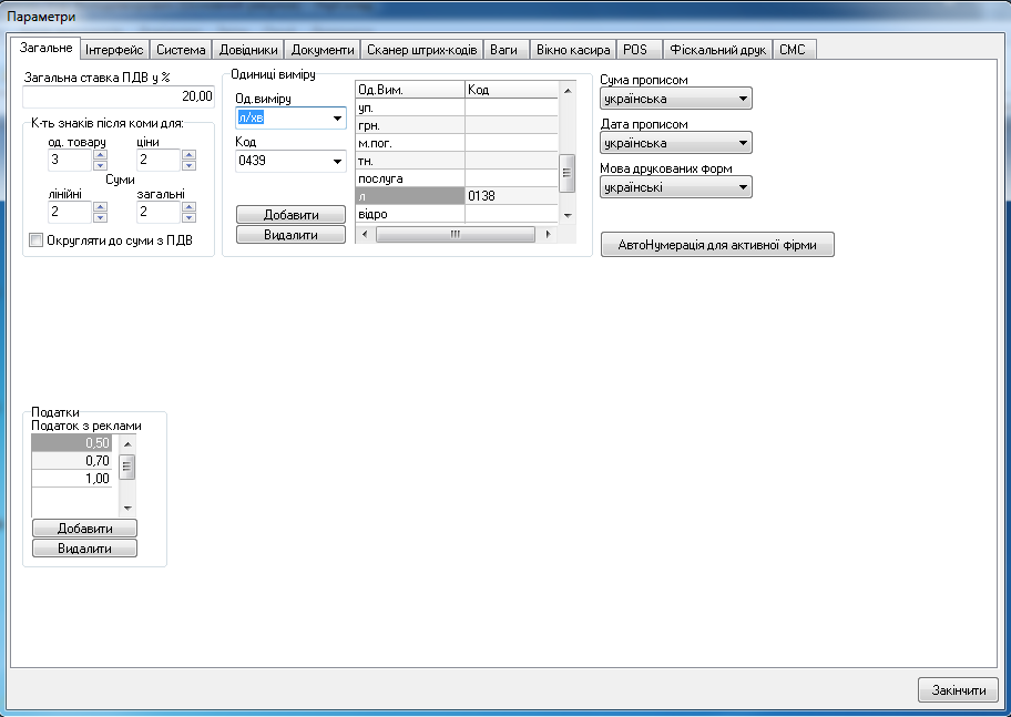 Параметри програми : вкладка Загальне (додавання нових одиниць виміру, вибір мови для друкованих форм, сум, дат)