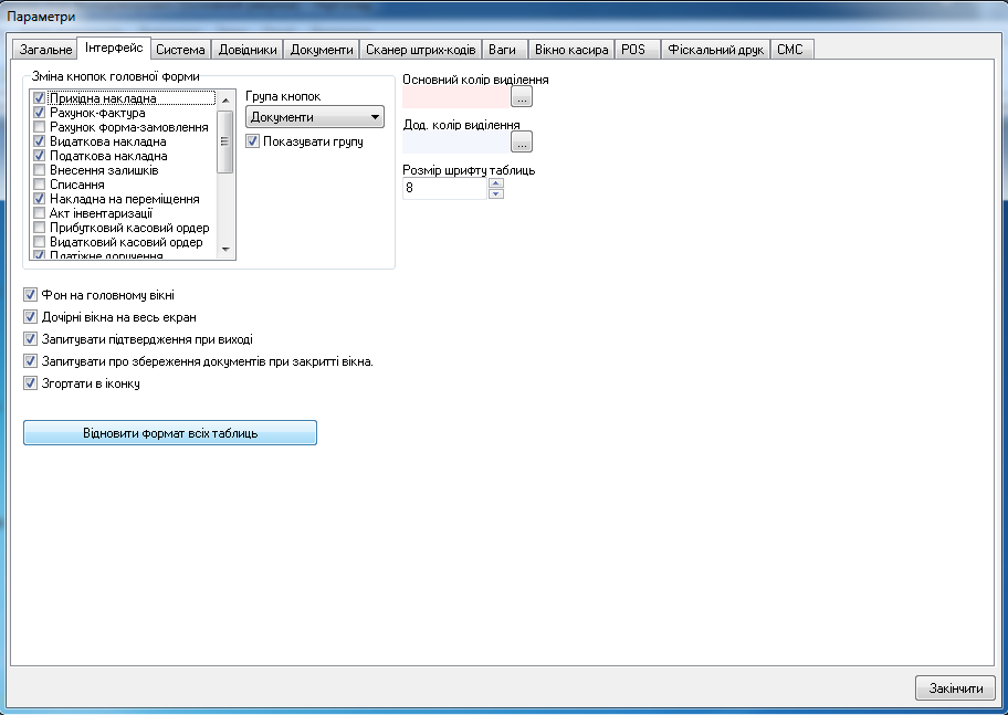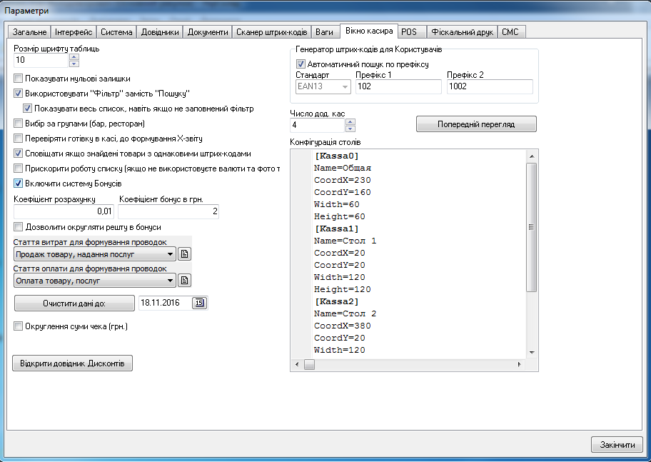 Параметри програми : вкладка Вікно касира (основні параметри документа, бонуси, додаткові каси, конфігурація столів)