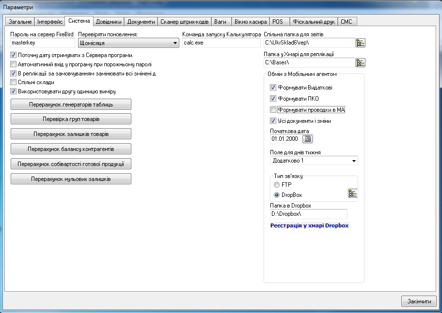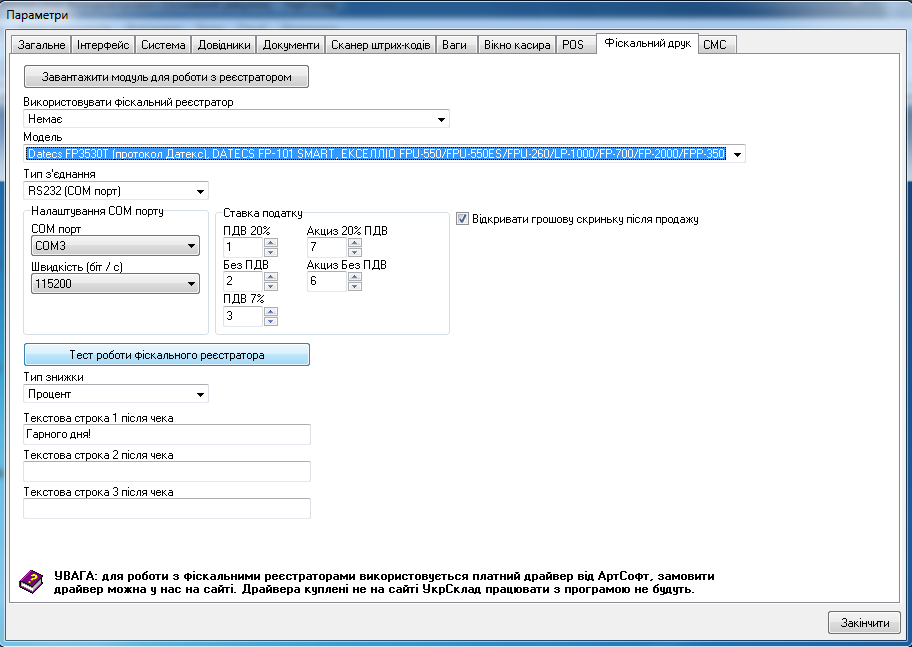 Параметри програми : вкладка Фіскальний друк (налаштування роботи з фіскальними реєстраторами)