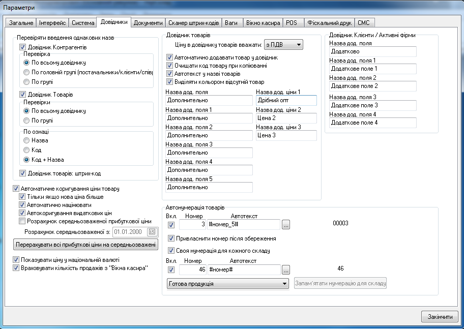 Параметри програми : вкладка Довідники (налаштування автокоригування цін, автонумерації товарів, додаткових полів довідників)