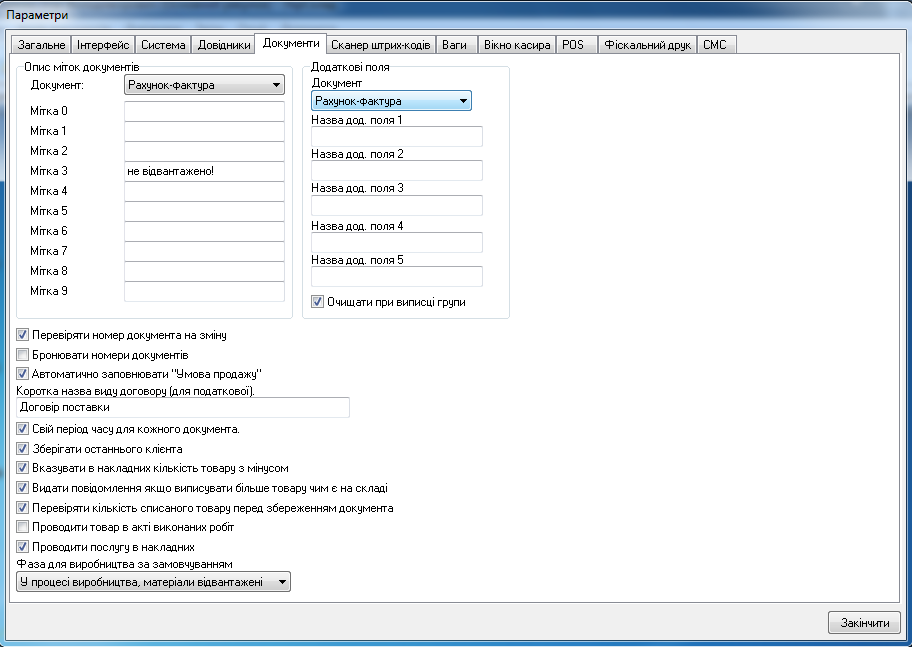 Параметри програми : вкладка Документи (опис міток, налаштування автоматизації для створення і проведення документів, додаткові поля)