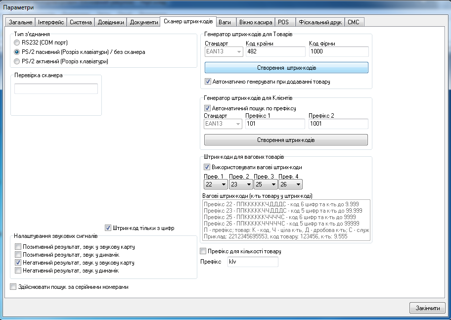 Параметри програми : вкладка Сканер штрих-кодів (налаштування сканера, генератор штрих-кодів для Товарів і Клієнтів, вагові штрих-коди)