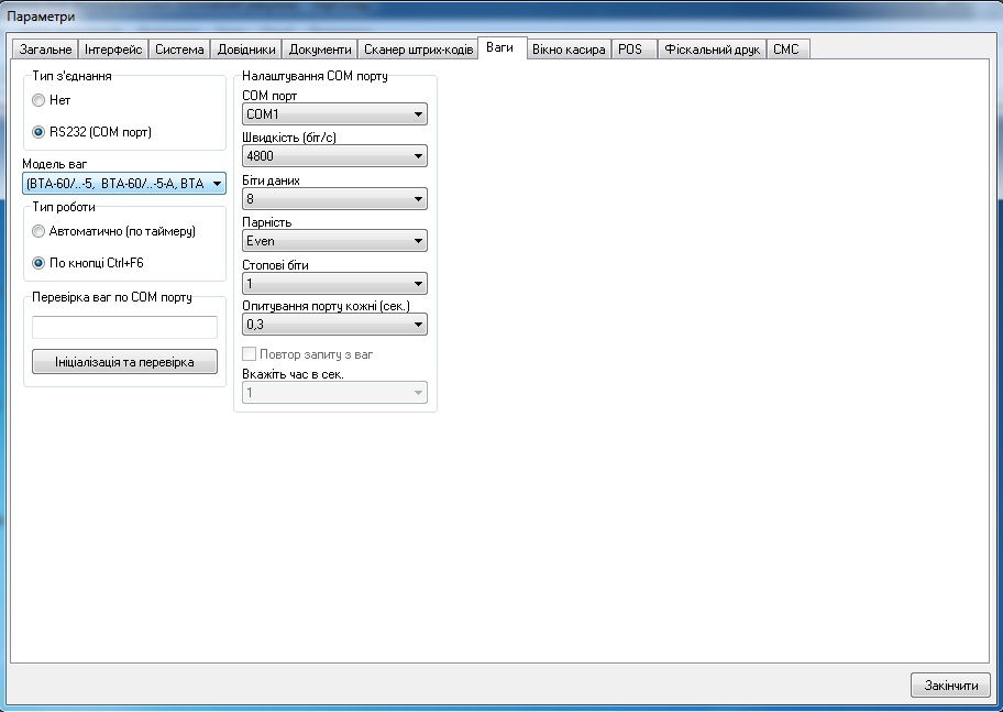 Параметри програми : вкладка Ваги (установка параметрів для роботи вагового обладнання)